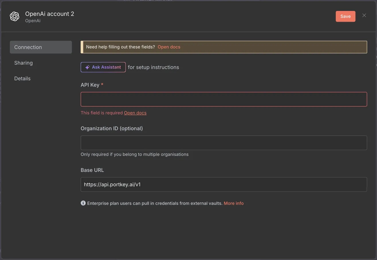 Now that you have your Portkey components set up, let’s connect them to n8n. Since Portkey provides OpenAI API compatibility, integration is straightforward and requires just a few configuration steps in your n8n workflow.